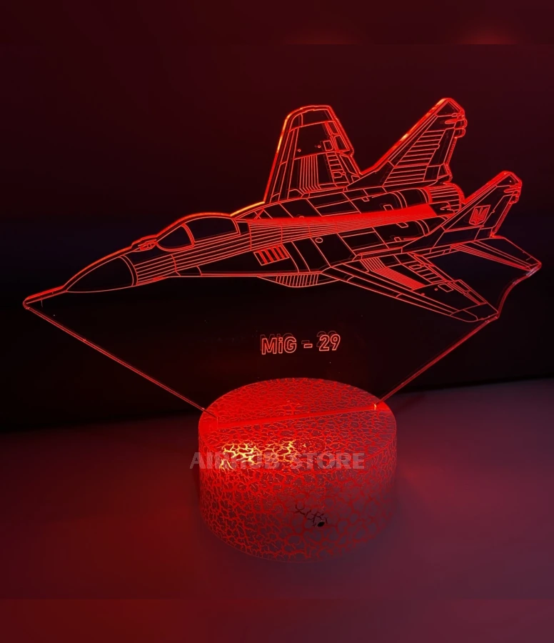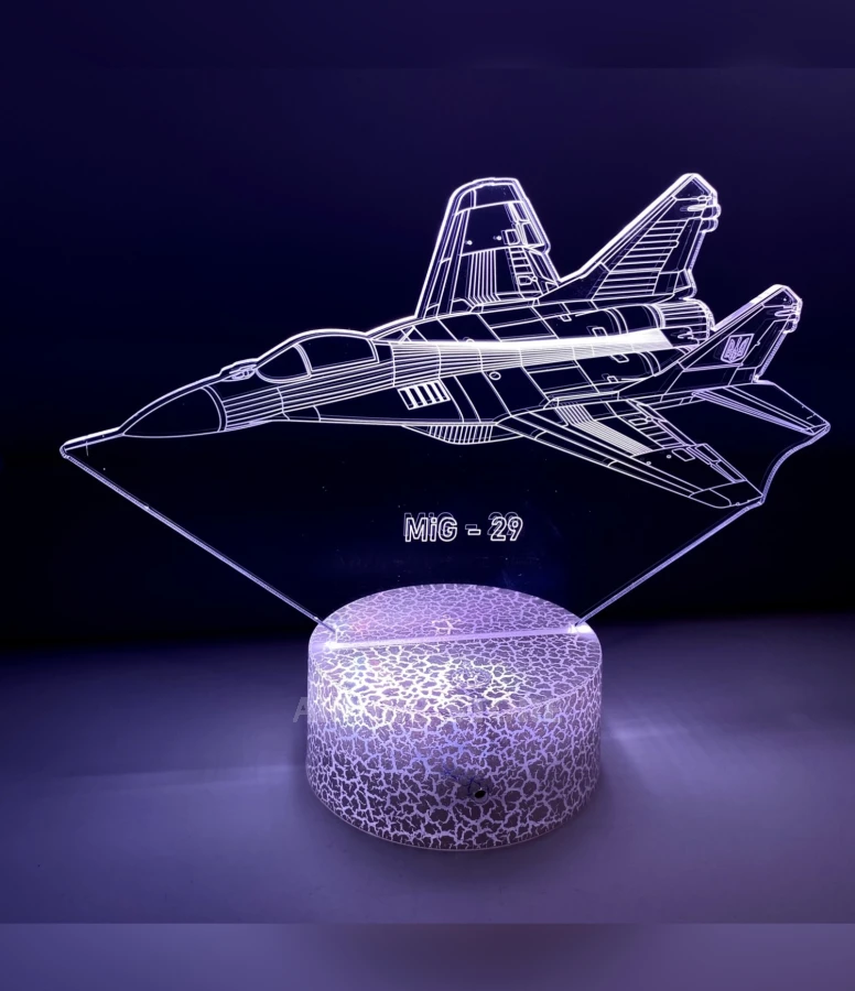 The MiG-29 is a fourth-generation multi-role fighter aircraft. It is currently in service in many countries, including Ukraine. Order a MiG-29 night light with 3D effect and remote light control right now and create a unique atmosphere in your room!