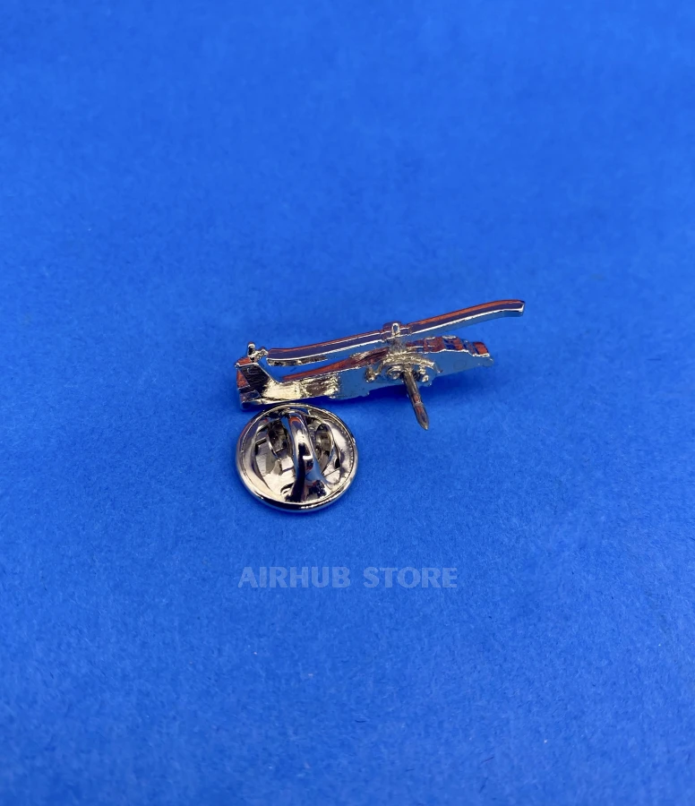 The AH-64 Apache metal pin reproduces the distinctive appearance of one of the world's most famous combat helicopters. The elongated fuselage, tandem cockpit, and recognizable rotor configuration create a clear and dynamic silhouette in miniature.