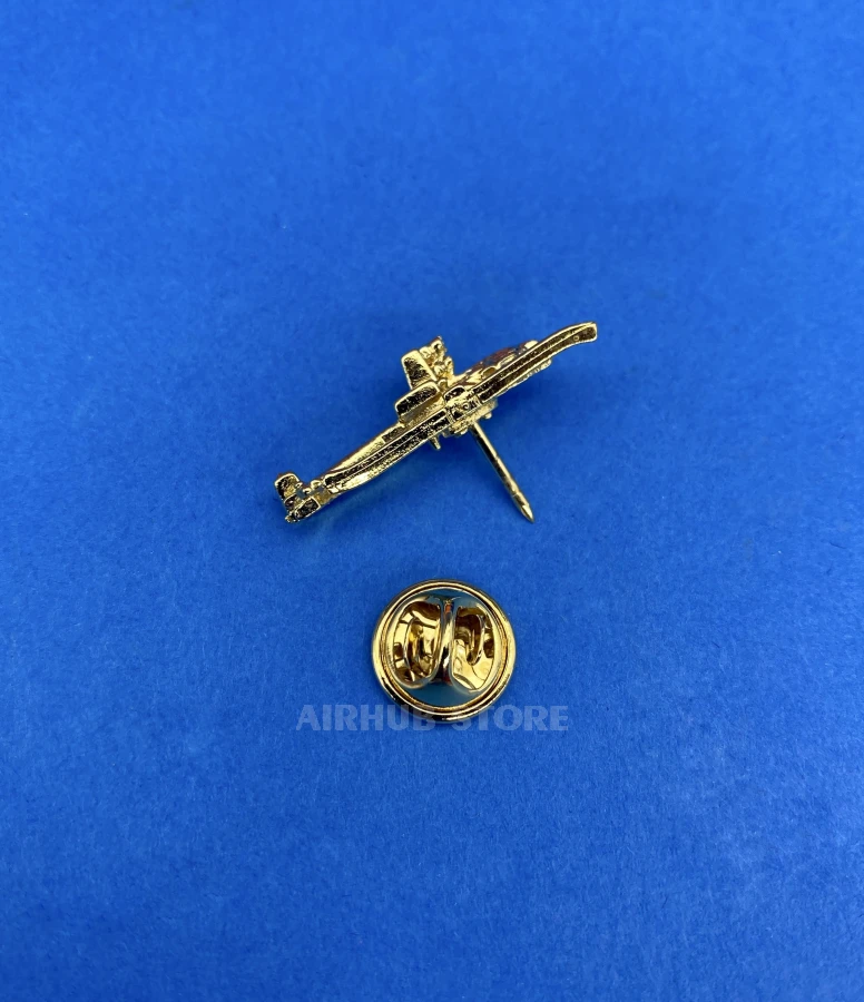 The AH-64 Apache metal pin reproduces the distinctive appearance of one of the world's most famous combat helicopters. The elongated fuselage, tandem cockpit, and recognizable rotor configuration create a clear and dynamic silhouette in miniature.