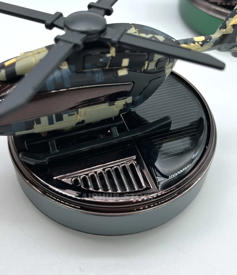 The flavorizer does not require any batteries, it works on its own. A small solar panel is built into the stand, which starts the helicopter's propellers when it is exposed to direct sunlight. It is attached with an adhesive reusable tape, and refilling the flavor is simple and convenient. The set comes with a bottle of essential oil and a dispenser.