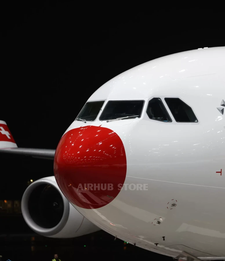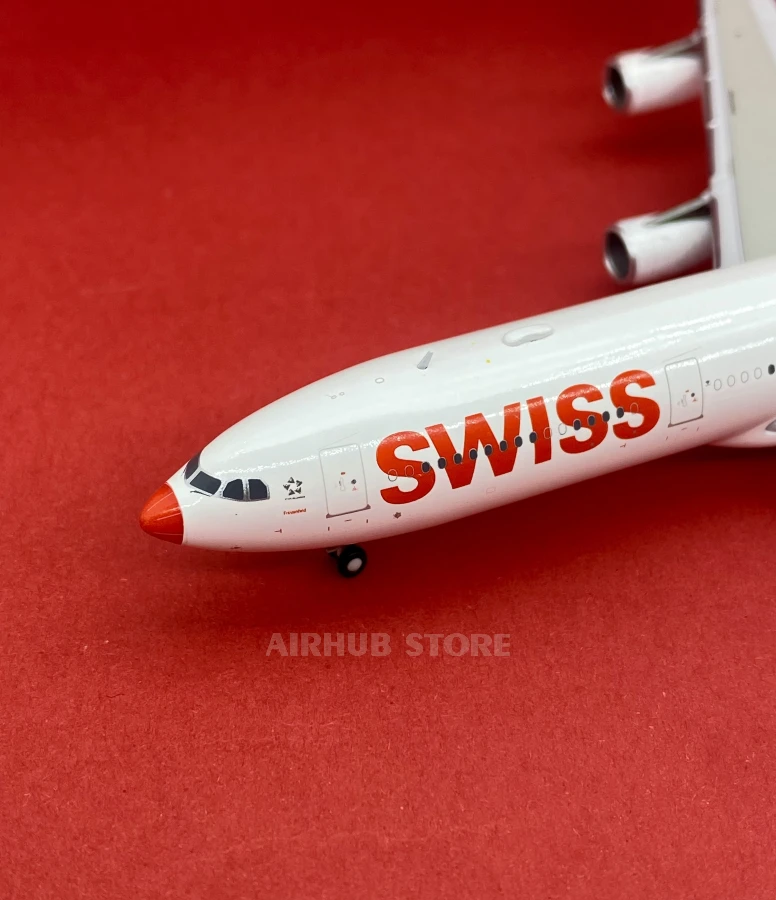 The model accurately reproduces the shape of the fuselage, four engines, swept wings, and signature SWISS design elements. It looks impressive both in a collector's display case and on a desk, reminding us of the beauty of long-distance flights.