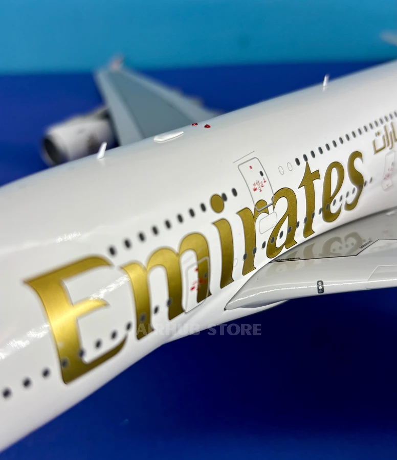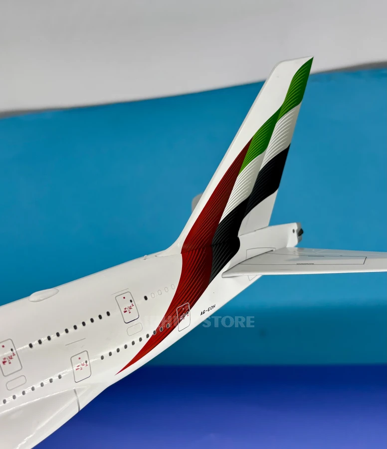 The vertical stabilizer features an updated design of the UAE national flag with smooth waves. The large gold-effect Emirates logos, Arabic lettering, and the exact location of technical elements and panels are all in line with the real aircraft.