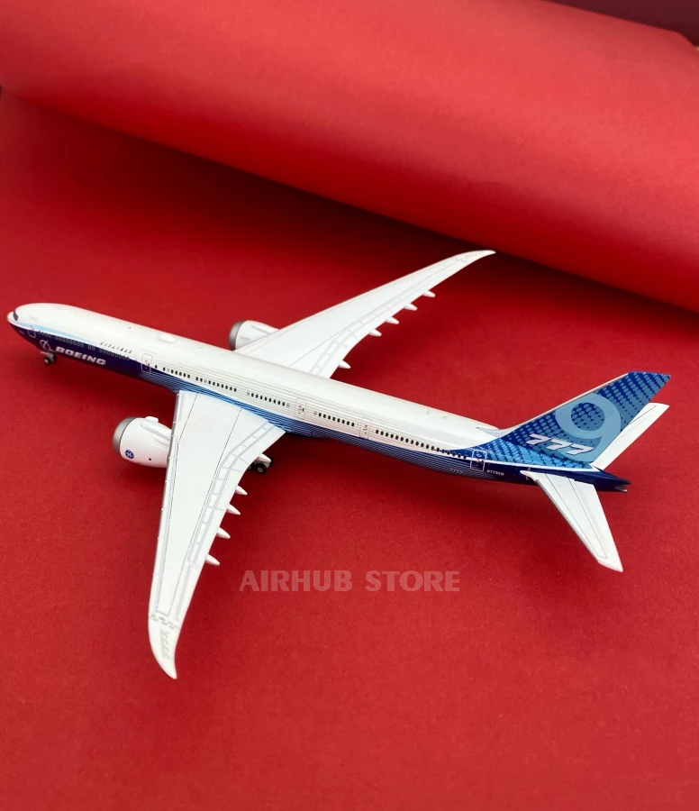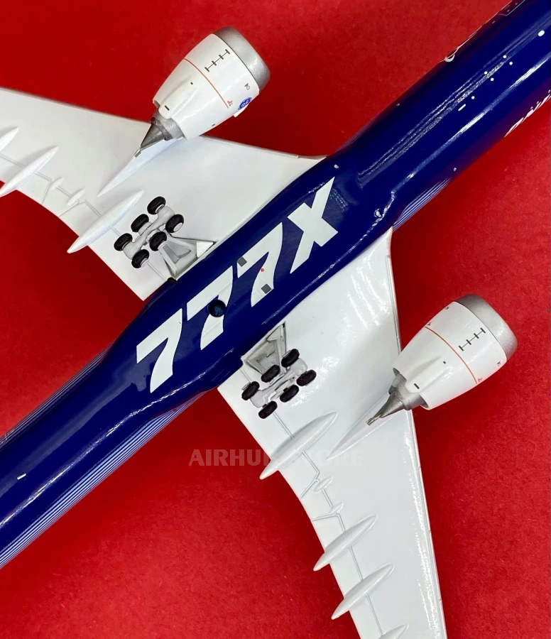 The Boeing 777-9X is a new generation of flagship long-haul airliner that combines innovation, increased capacity, and improved flight efficiency. The 1:400 scale model shows the recognizable features of the aircraft: an elongated fuselage, new wings, distinctive test livery, and N779XW registration.