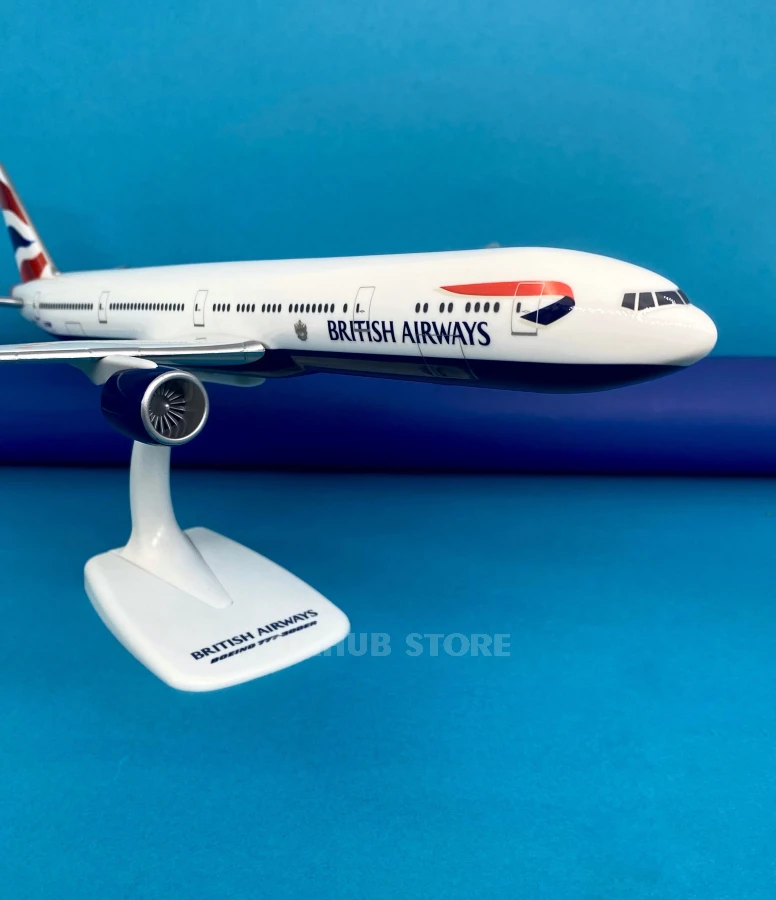 The 1:200 scale model of the Boeing 777-300ER reproduces the real airliner in British Airways livery. The registration number G-STBP is printed on the fuselage, corresponding to the real aircraft of the airline.
