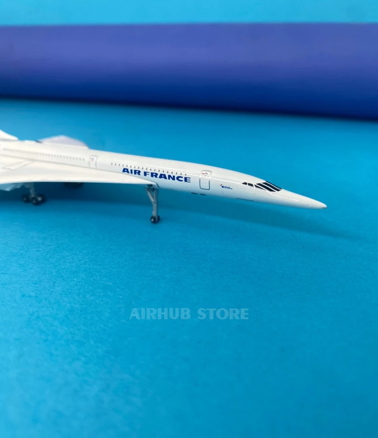 The 1:400 scale model depicts the version in the corporate livery of Air France, which operated the Concorde. The detailed model captures the distinctive features of the original aircraft: swept wings, engines, sleek fuselage, and legendary nose.