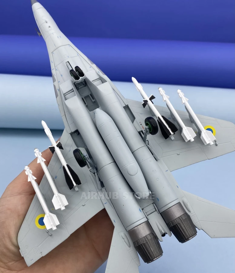 The model is made of metal with separate plastic parts and features highly detailed cockpit, landing gear, tail section, and weaponry. The set includes a stand for convenient display. It is the perfect gift for fans of Ukrainian aviation, history, and modern technology. The set also includes a set of weapons for the aircraft.