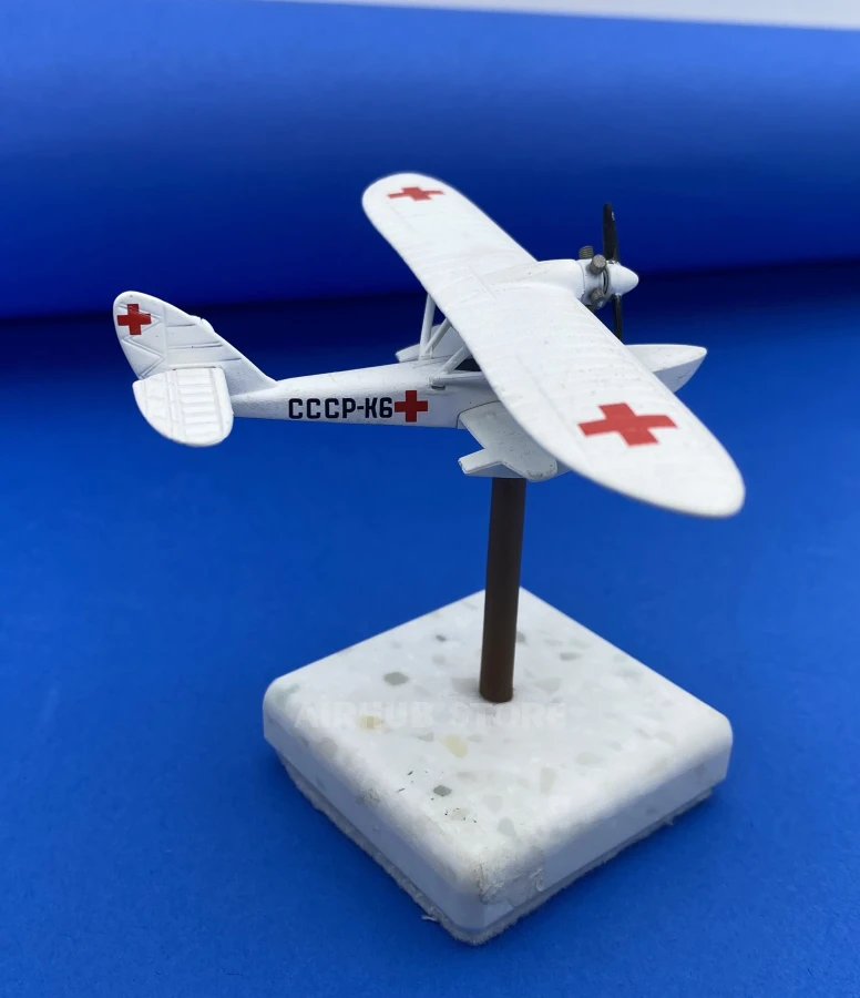 The model accurately reproduces the shape of the fuselage, the wind engine, the struts between the wings, and the characteristic white livery with red crosses. Thanks to its compact size and stand, the aircraft can be easily placed on a shelf, display case, or desk.