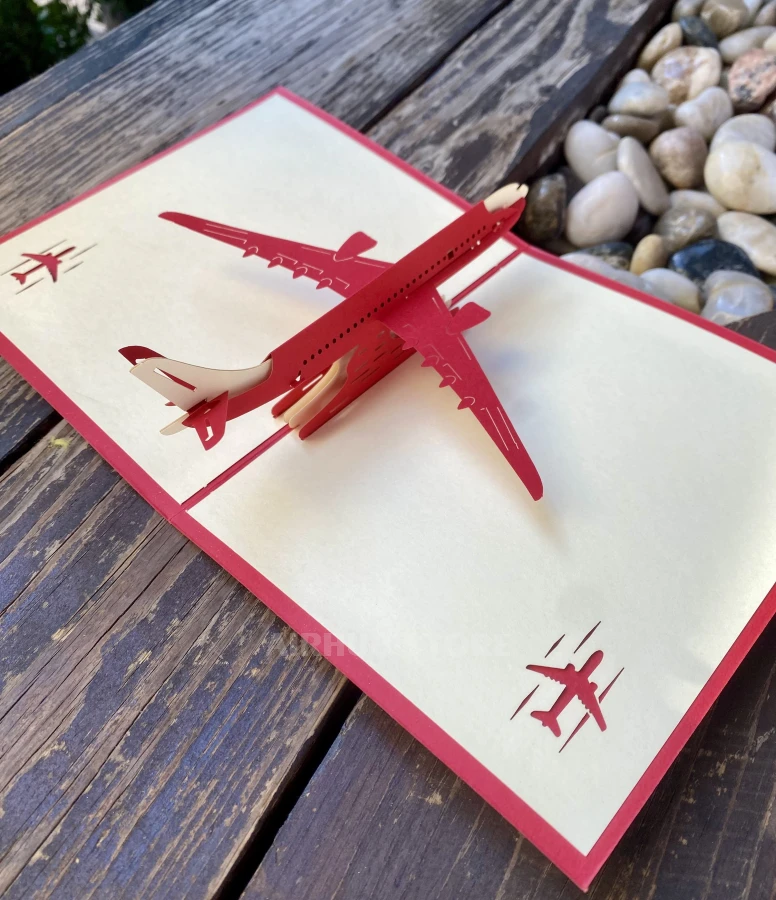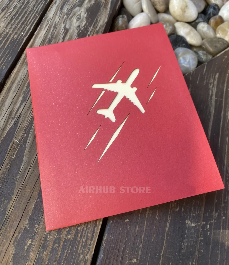 This voluminous 3D card combines classic style and modern design. On the outside, it looks like an elegant card with an airplane-shaped cutout, but inside it hides a surprise: a detailed three-dimensional model of a passenger airliner unfolds.