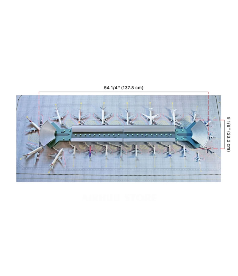 The terminal is made of durable resin and is over 137 cm long. It is equipped with 22 gates for parking aircraft, as well as movable and adjustable telescopic air bridges that can be adapted to different types of airliners. Built-in LED lighting creates the effect of a night airport and adds maximum realism to the model.