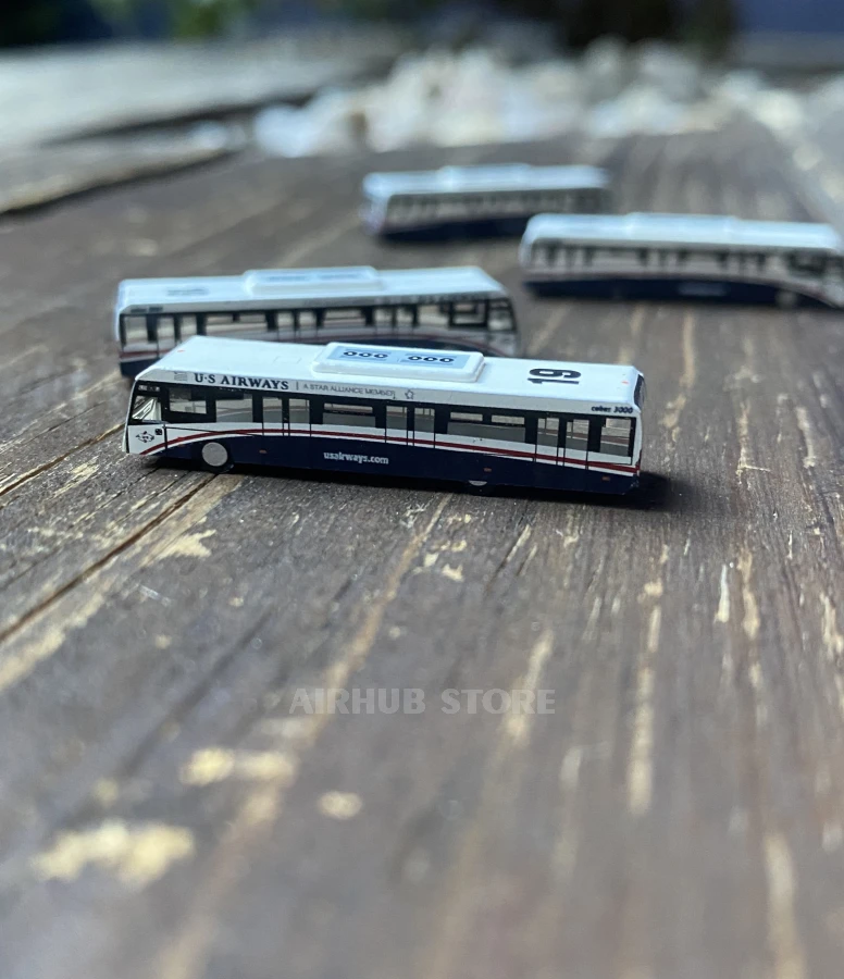 Cobus 3000 airport buses are a true symbol of ground handling at international airports. This set from Gemini Jets features 4 miniature buses in the corporate colors of U.S. Airways.