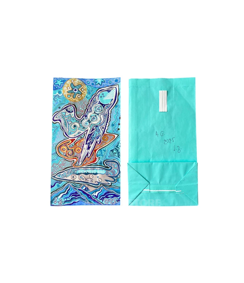 The idea came to him right during a flight—when the artist was looking for any surface to sketch on. The result is a series of works, some of which were created right in the sky, and others after landing. Each of these bags preserves not only the image but also the very moment of the flight.