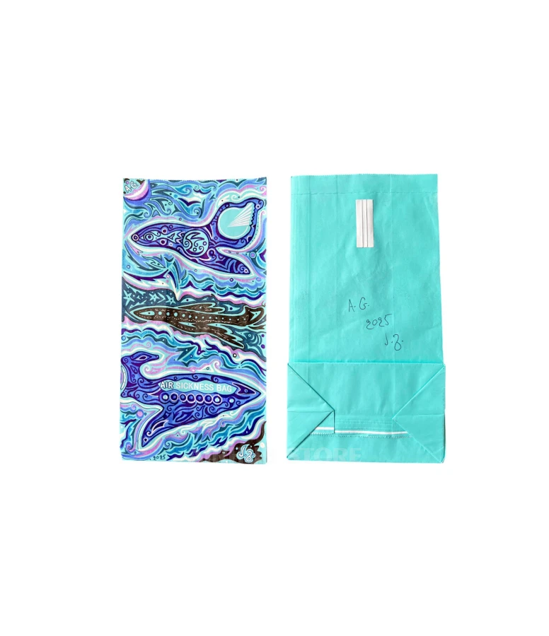 Original bags from the plane featuring original artwork from the Art Avia project. Each piece is a unique work created during or after the flight. An unusual format that combines aviation and contemporary art.