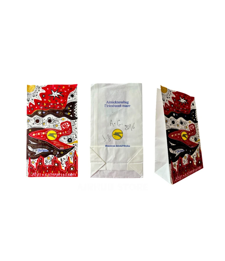 There is a distinct genre in the world known as “sickness bag art”—where artists use airline vomit bags as a canvas for their work. But these are usually isolated experiments or hobby projects. In the case of Art Avia, this is already a full-fledged exhibition project that was presented at the Museum of Modern Art of Ukraine in Kyiv in 2013.