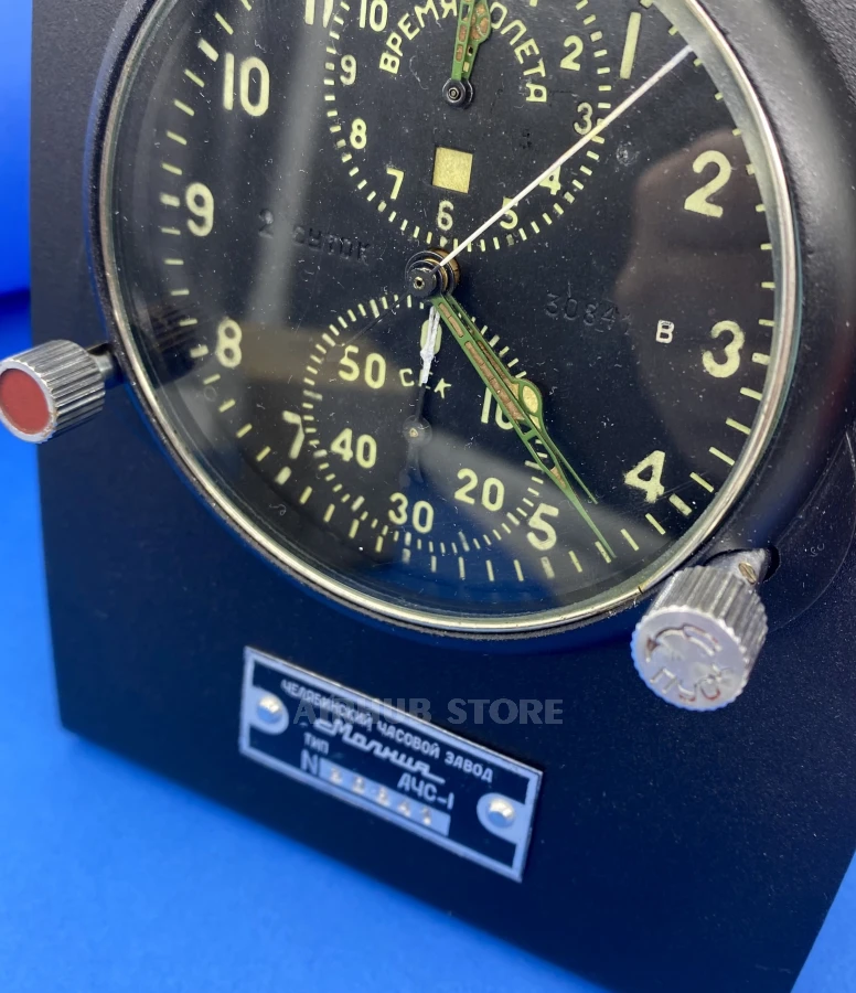 At the top of the stand is a silhouette of an aircraft, at the bottom is a stylized metal plate with a detailed description (the description indicates: type, serial number). There are two inscriptions: "Chelyabinsk Watch Factory" and "Molniya". Please note that each plate is made according to factory standards and is also an original part of the device. The inscriptions are made according to GOST 26.008-85 (applicable only in aviation).