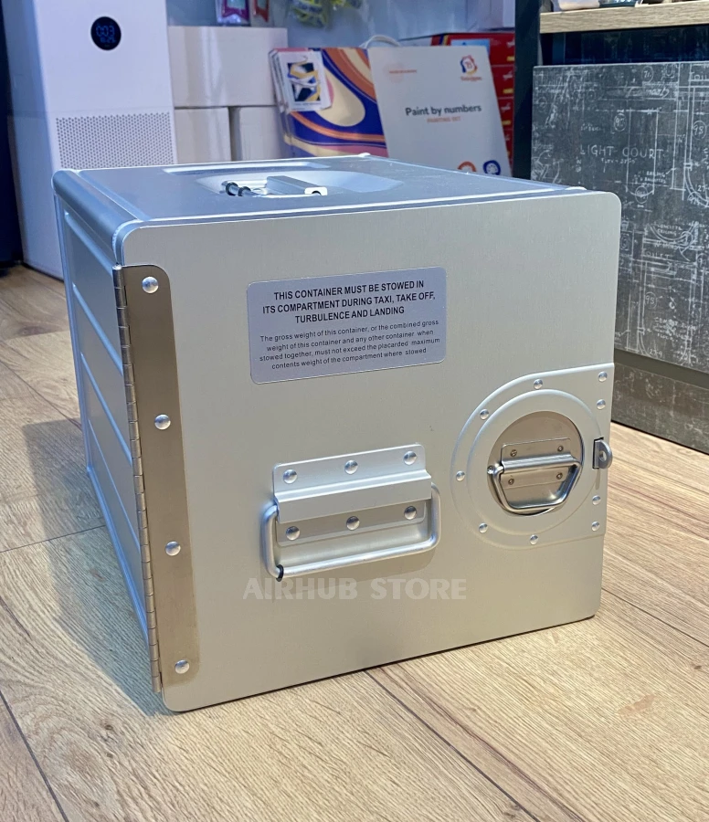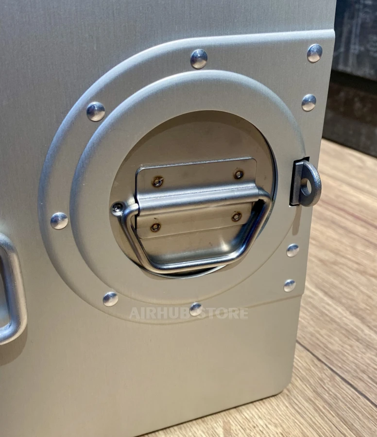 This aviation storage container is made of aluminum alloy and stylistically refers to real onboard equipment used in aviation. Clear geometry, rivets, reinforced panels, and massive fittings form a restrained technical look without decorative excesses.