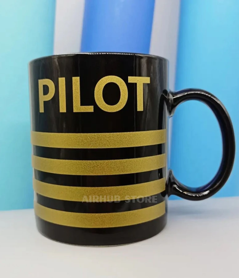 Ceramic mug with the inscription PILOT and golden stripes - a symbol of the captain's rank. An ideal accessory for civil aviation pilots, cadets and anyone who dreams of the sky. Durable coating, laconic design and a sense of profession in every sip.
