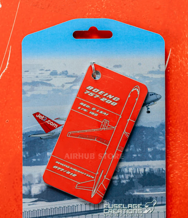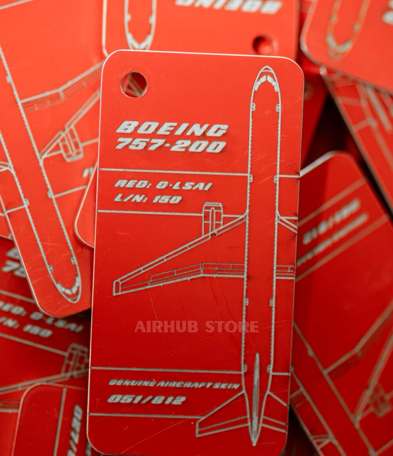 This aviation keychain is made from a fragment of the fuselage of the Boeing 757-200 G-LSAI, a true legend of the sky. The aircraft first flew in 1987 as B-2803 under the Chinese CAAC, and in 1988 it became part of China Southern Airlines. In 2006, the aircraft was acquired by the British carrier Jet2.com and received G-LSAI registration.