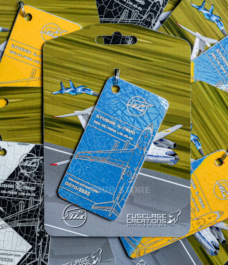 The keychain is made from the original fuselage of the legendary Il-76MD transport aircraft (UR-76618), known under the NATO name Candid. A unique piece of aviation history, created for the 5th anniversary of Fuselage Creations.