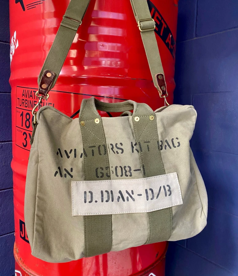 The Aviator's Kit Bag is the true embodiment of authentic military design, inspired by the equipment of World War II pilots. Made of durable canvas with genuine leather accents, it has a recognizable look with stenciled lettering that once adorned real US pilot bags.