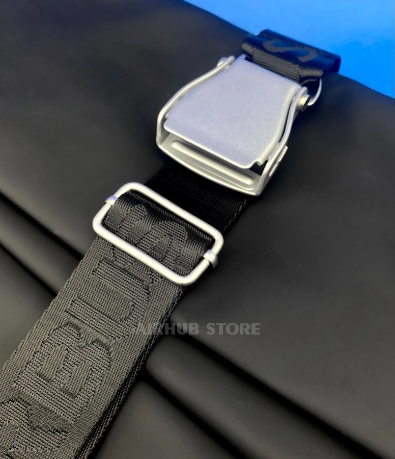 A unique leather strap with a buckle, similar to airplane seat belts, that adds uniqueness and aviation style to your look.