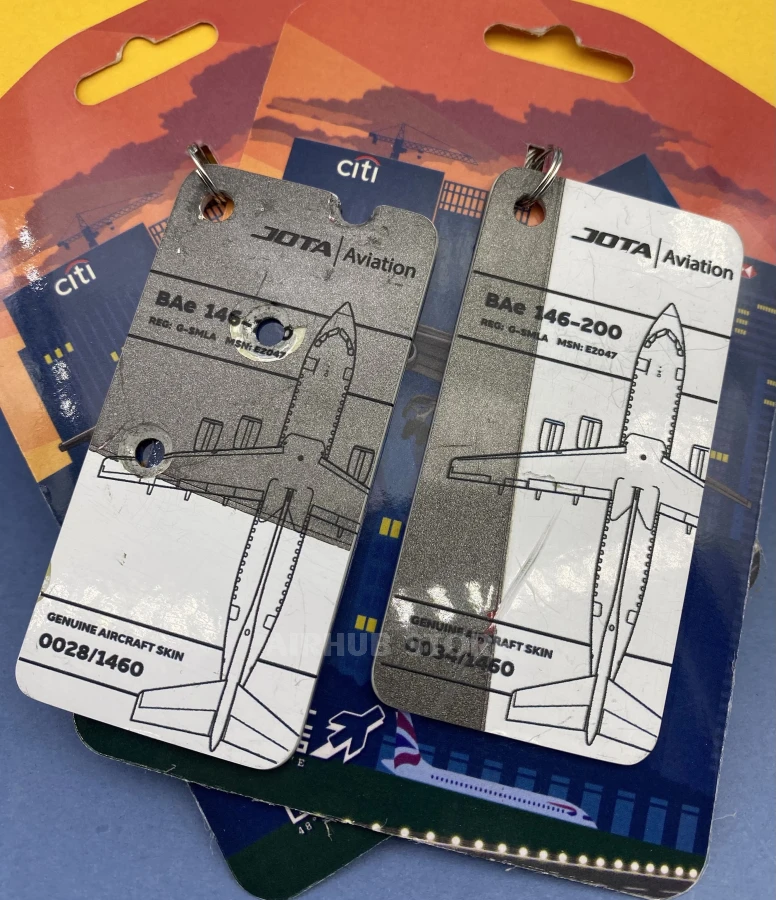 The keychain is made from a real JOTA Aviation BAe 146-200 aircraft. The British Aerospace BAe 146 is the most successful British civilian jet aircraft, produced by British Aerospace (later part of BAE Systems) in the early stages of the program, and a later version known as the Avro RJ produced by Avro International Aerospace. In total, more than 390 BAe 146/Avro RJ aircraft were built, making it a popular regional and short-haul aircraft of its time.