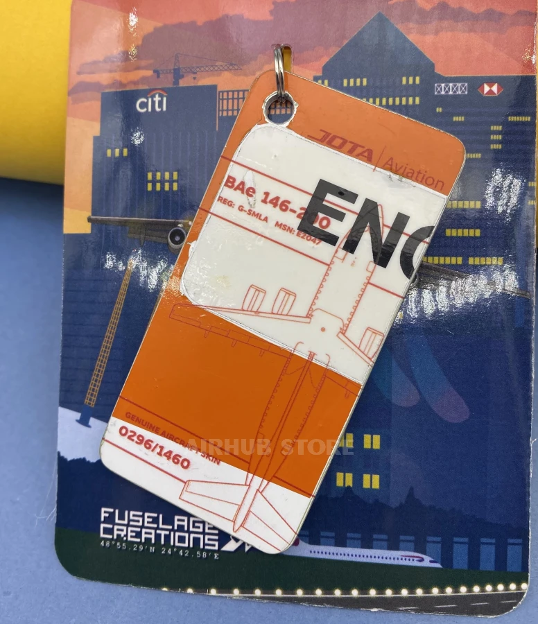 The keychain is made from a real JOTA Aviation BAe 146-200 aircraft. The British Aerospace BAe 146 is the most successful British civilian jet aircraft, produced by British Aerospace (later part of BAE Systems) in the early stages of the program, and a later version known as the Avro RJ produced by Avro International Aerospace. In total, more than 390 BAe 146/Avro RJ aircraft were built, making it a popular regional and short-haul aircraft of its time.