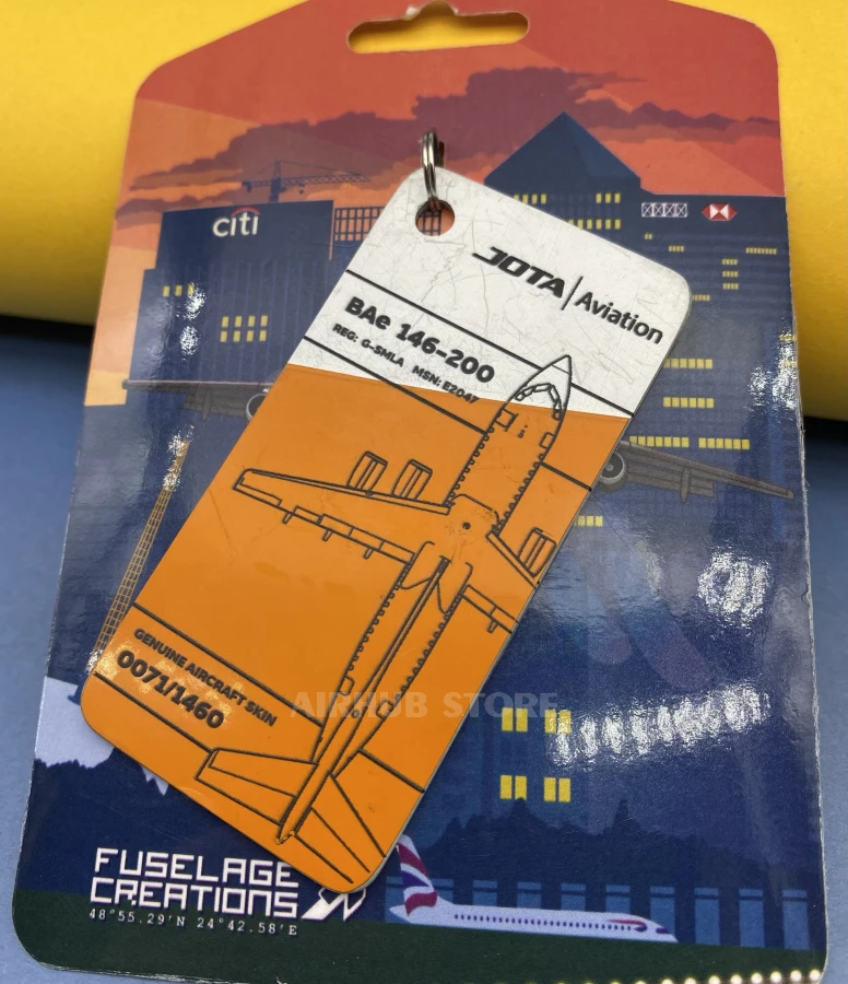 The keychain is made from a real JOTA Aviation BAe 146-200 aircraft. The British Aerospace BAe 146 is the most successful British civilian jet aircraft, produced by British Aerospace (later part of BAE Systems) in the early stages of the program, and a later version known as the Avro RJ produced by Avro International Aerospace. In total, more than 390 BAe 146/Avro RJ aircraft were built, making it a popular regional and short-haul aircraft of its time.