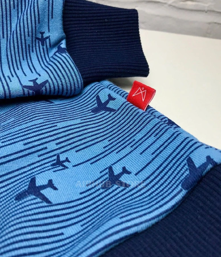 Discover this blue airplane print sweatshirt from Agent's clothes that combines style and comfort. Its deep blue color is reminiscent of the endless sky, and the print with airplanes and stripes emphasizes your passion for aviation.