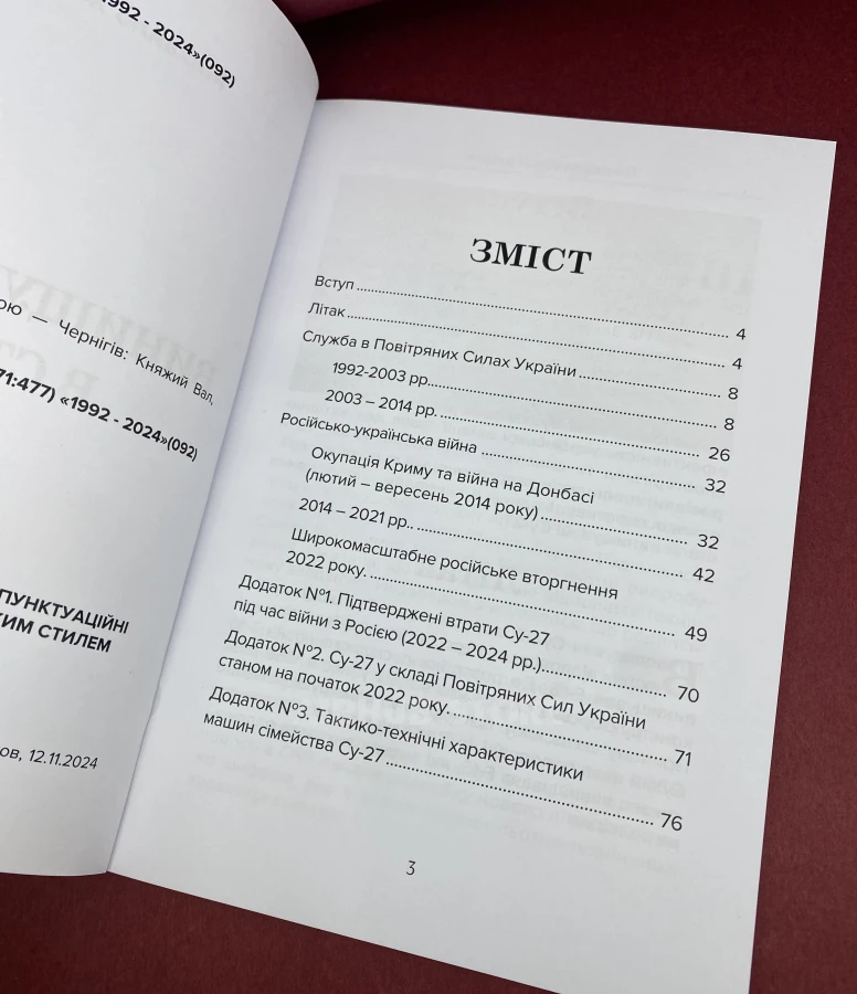 Separate appendices contain a list of confirmed losses, lists of aircraft in service, and a table of tactical and technical characteristics of the Su-27 family models. This makes the publication a valuable resource not only for historians but also for anyone interested in aviation, defense, and the modern military history of Ukraine.