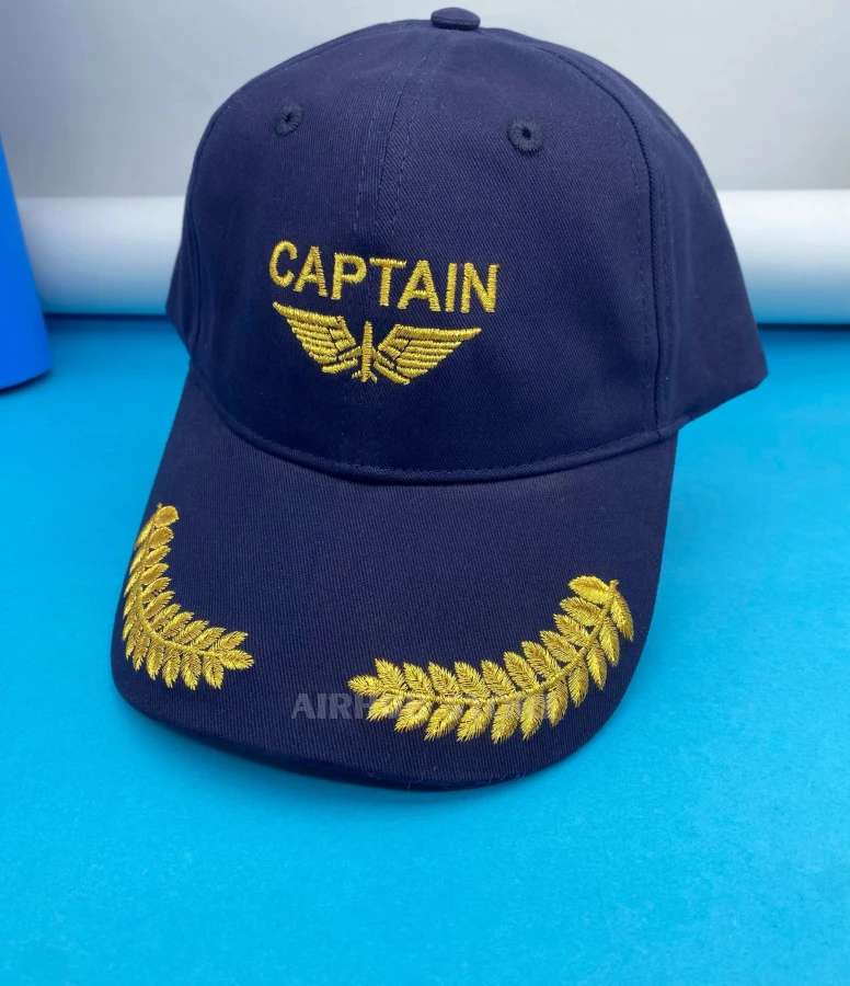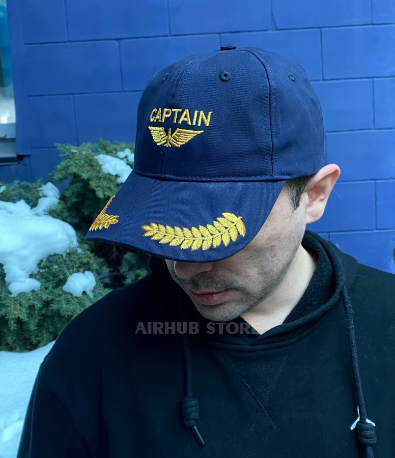 This cap was created with a distinct aviation theme and references to the iconic image of an aircraft commander. The embroidered Captain lettering, wings, and gold elements on the visor create a recognizable pilot aesthetic associated with experience, responsibility, and authority in the cockpit.