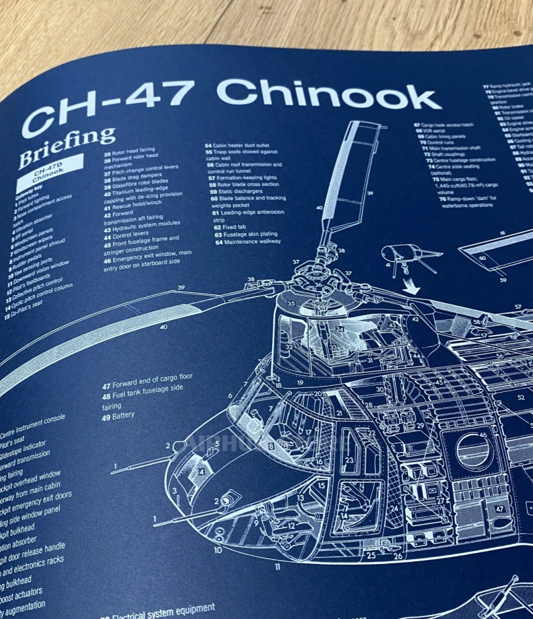Poster with drawing of the CH-47 Chinook helicopter, the dark blue poster shows the layout diagram of this helicopter. All elements are numbered and described around the image, where a transcription with description is indicated. The poster itself is printed on heavy blue paper, measuring 61 cm by 33 cm.