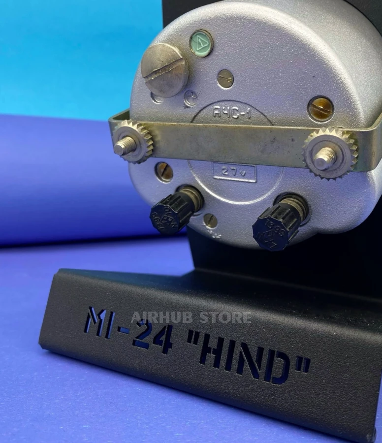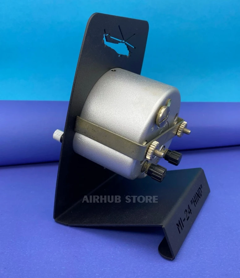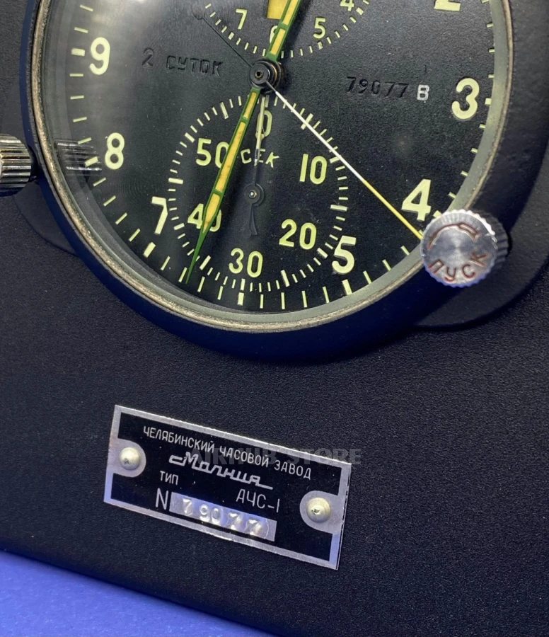 At the top of the stand is a silhouette of an aircraft, at the bottom is a stylized metal plate with a detailed description (the description indicates: type, serial number). There are two inscriptions: "Chelyabinsk Watch Factory" and "Molniya". Please note that each plate is made according to factory standards and is also an original part of the device. The inscriptions are made according to GOST 26.008-85 (applicable only in aviation).