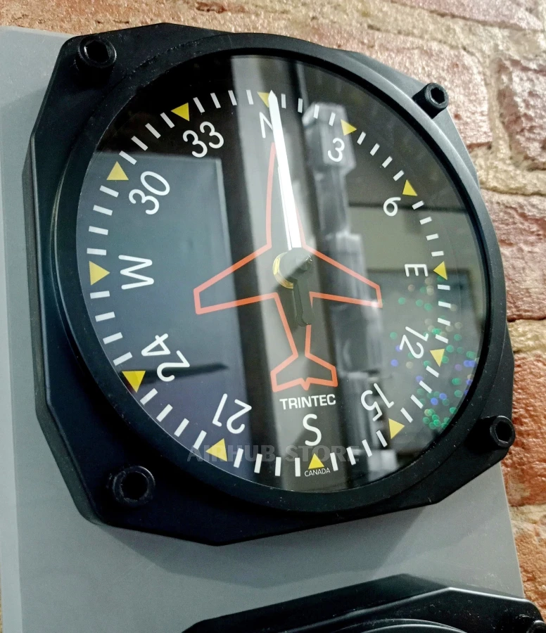 This wall set - a combination of a clock and a thermometer - is based on the design of real aviation indicators. The upper device is stylized as a gyroscopic compass (heading indicator) with a red airplane silhouette in the middle. Its hands show the time as if it were an orientation in space. The lower one is a replica of an airspeed indicator, which simultaneously shows the temperature in degrees Celsius.