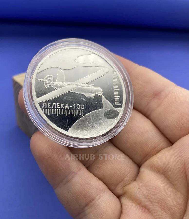 The reverse of the coin depicts a reconnaissance complex glider in flight. Above it is a stylized outline of a stork, symbolizing peace and tranquility, which are ensured thanks to the vigilance of “Leleka-100.” The lower part of the composition shows the Earth's surface with a schematic diagram of the flight path, reflecting strategic vision and planning. The stylized vertical and horizontal scales symbolize the complex's ability to determine the coordinates of targets and correct artillery fire. On the left below, parallel to the drone, is the inscription LELEKA-100.