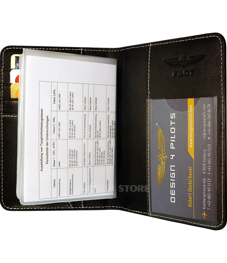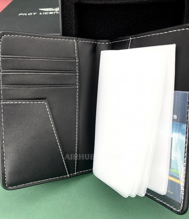 Inside there are six plastic pockets for a pilot's license, medical card, etc. There are three more pockets for credit cards, one for a business card, and one for paper and logo embossing.