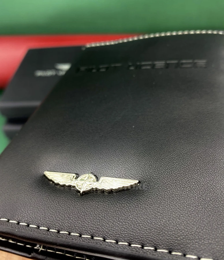 This elegant license cover is made of high quality eco-friendly leather with logo embossing and a silver metal wing on the front. The cover is equipped with RFID protection.