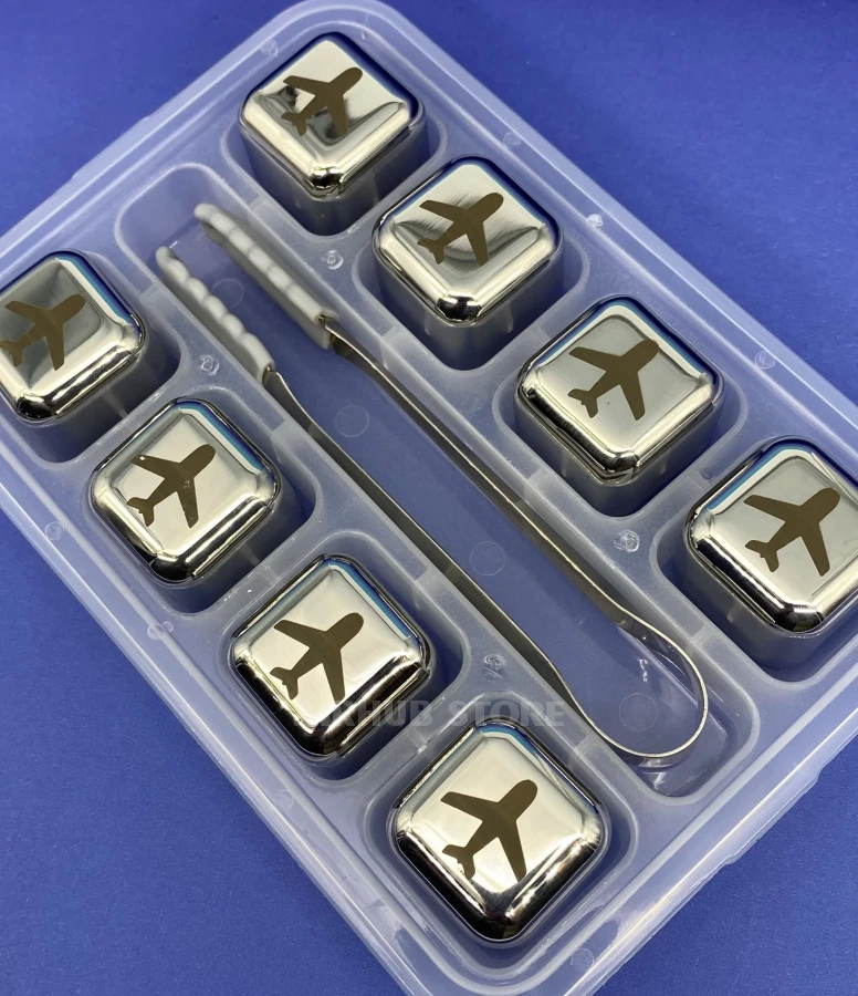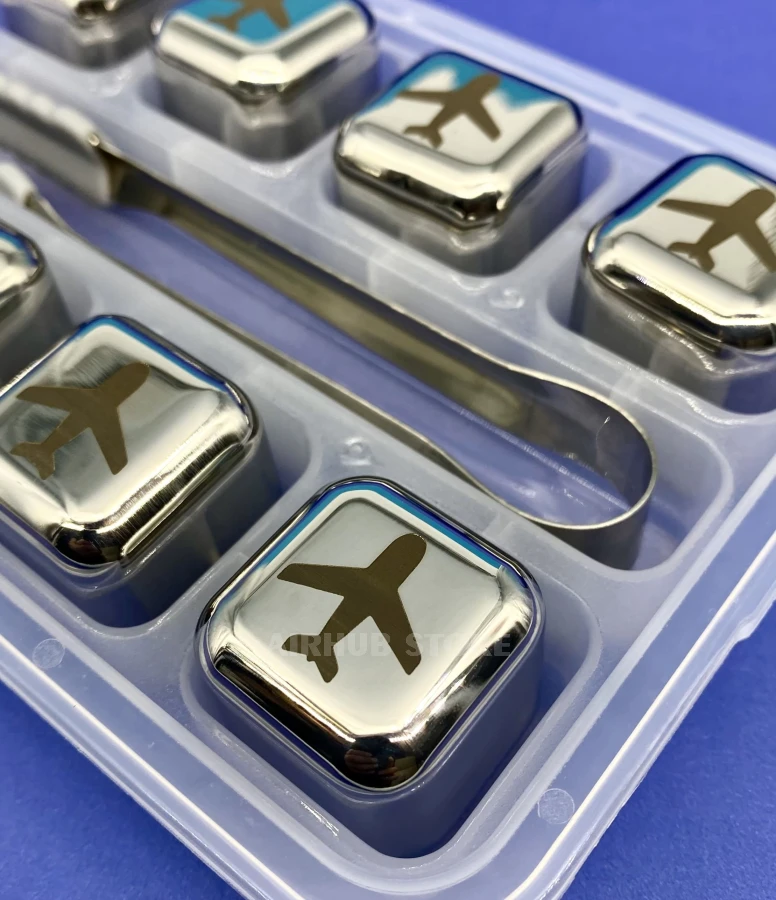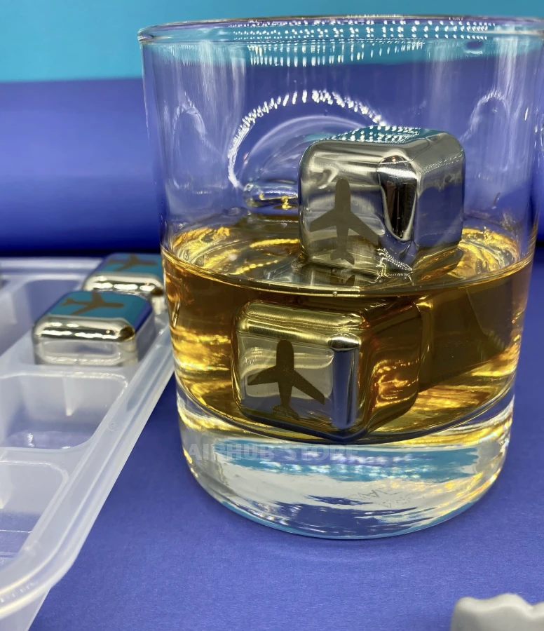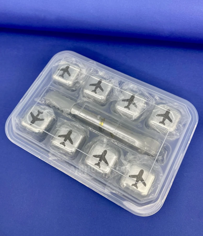 This set of eight metal cooling cubes decorated with an airplane engraving is a stylish alternative to ice that keeps drinks cold without dilution. The cubes are made of food-grade stainless steel, freeze quickly and keep their temperature for a long time. The set also includes handy tongs and a transparent organizer for freezer storage.