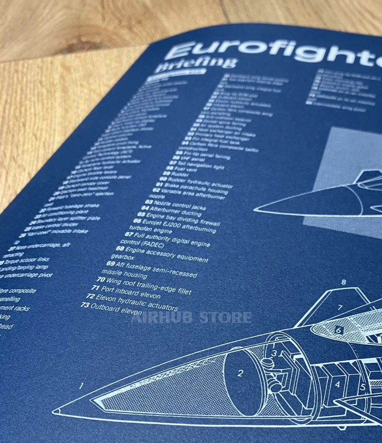 The poster is designed in the style of a classic engineering drawing, with an accurate depiction of the design of one of the most advanced European fighter jets. The Eurofighter Typhoon is a fourth-generation multi-role fighter jet. The Typhoon has been adopted by the air forces of Great Britain, Germany, Italy, Spain, Austria, and Saudi Arabia. In 2017, deliveries of fighter jets to Oman began. As of November 2013, the total number of orders was 571 aircraft. The Typhoon was originally designed as a fighter to gain air superiority, but during development and operation, it gained the ability to strike ground targets, becoming a multi-role combat aircraft.