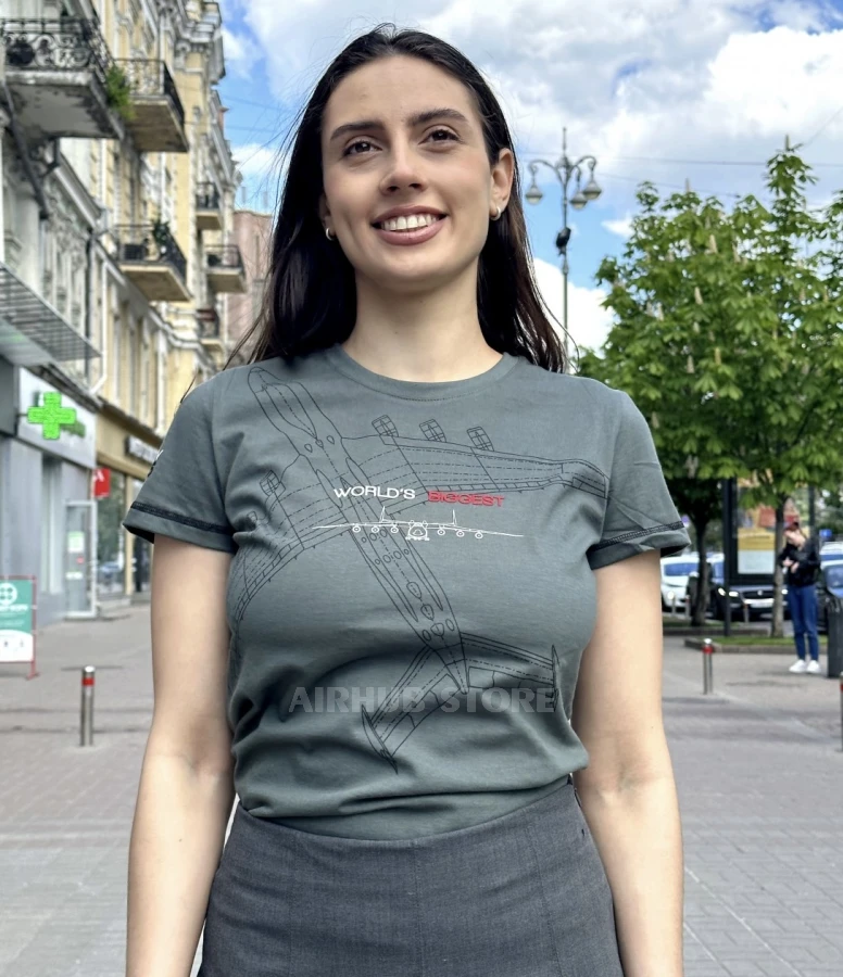 An original women's T-shirt featuring the AN-225 Mriya airplane.