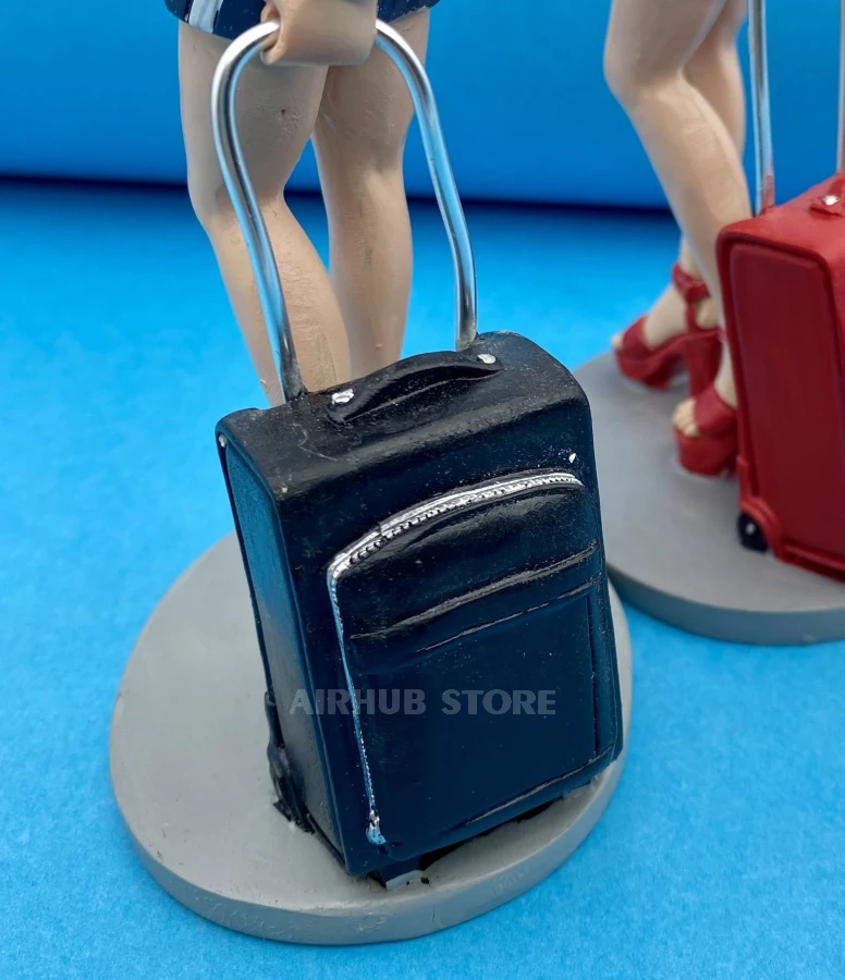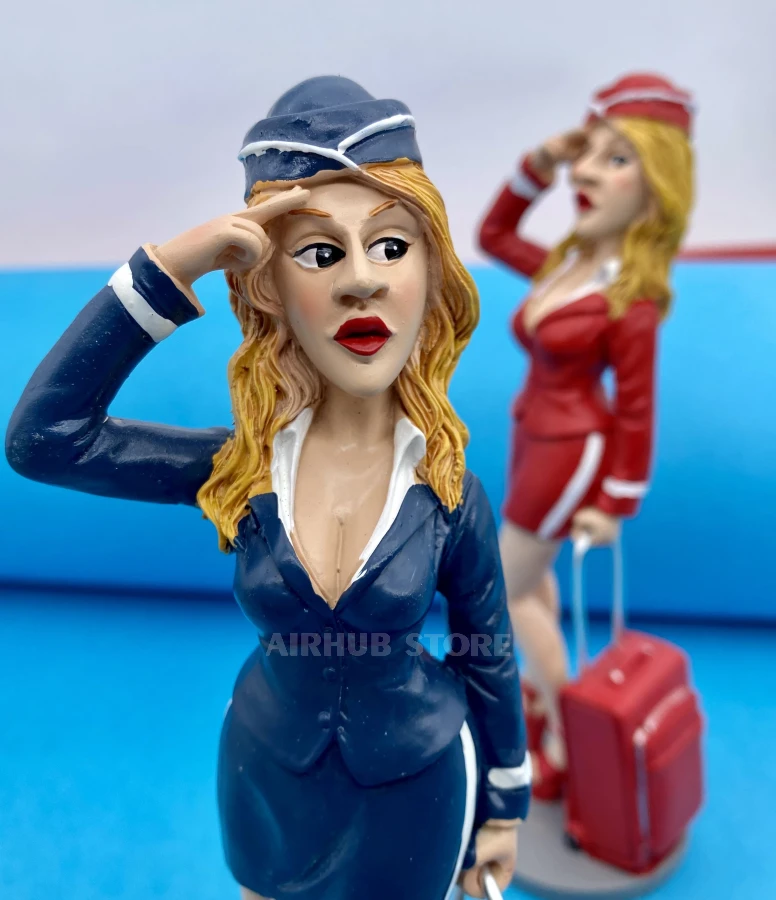 Figures of charismatic stewardesses in red and blue uniforms are a stylish and cheerful aviation souvenir. Each of them is holding a suitcase, posing with a smile and giving a humorous greeting as if she had just met passengers at the gate.