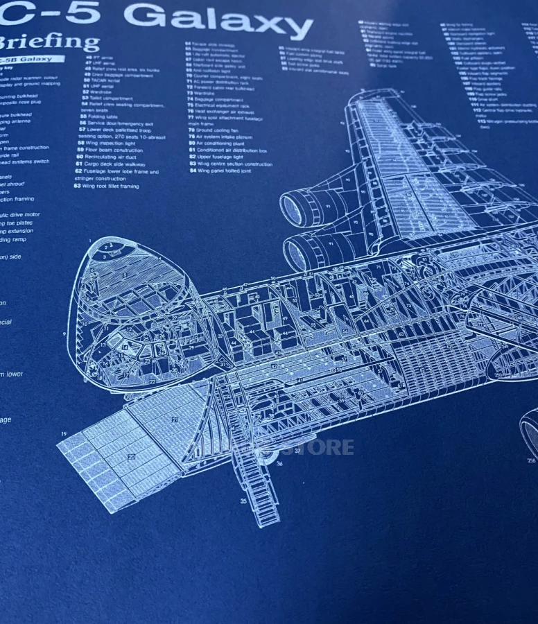 Poster with drawing of C-5 Galaxy airplane The dark blue poster shows the layout diagram of this airplane. All elements are numbered and described around the image where a transcription with description is indicated. The poster itself is printed on heavy blue paper, measuring 61 cm by 33 cm.