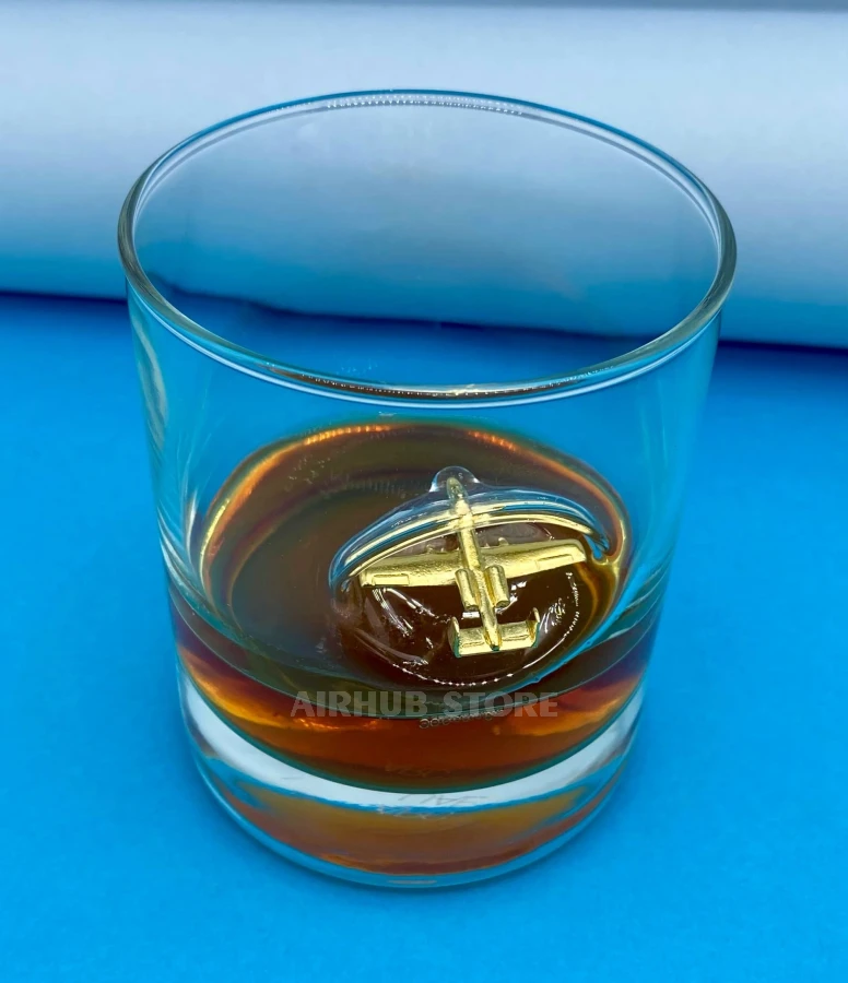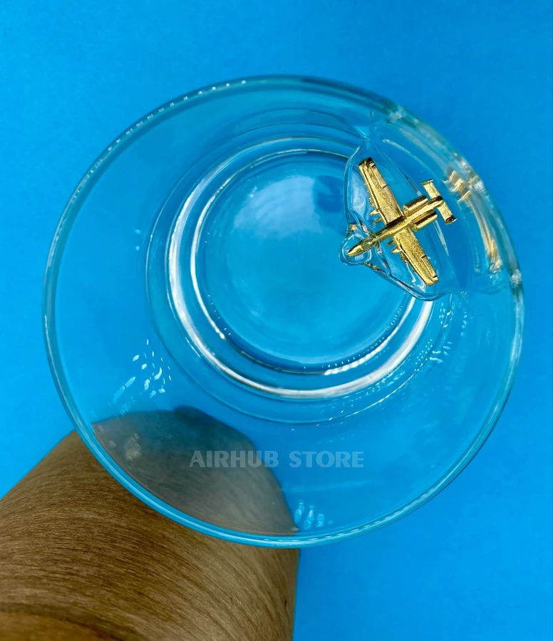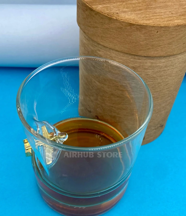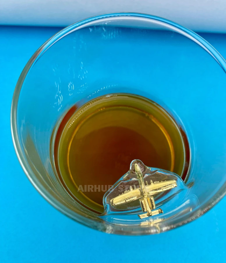 In this glass, a metal miniature of the aircraft is integrated into the glass in such a way that the fighter seems to cut through the drink. Thanks to the transparent glass, the perception of depth changes, and the effect itself looks different depending on the color and level of the liquid.