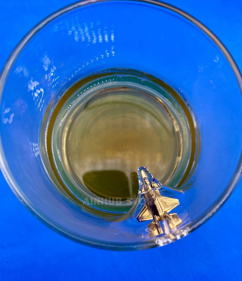 The design of this glass is based on the effect of movement. The metal F-35 Lightning II fighter jet is attached to the inner wall of the glass in such a way that it looks as if the plane is flying right into the glass.