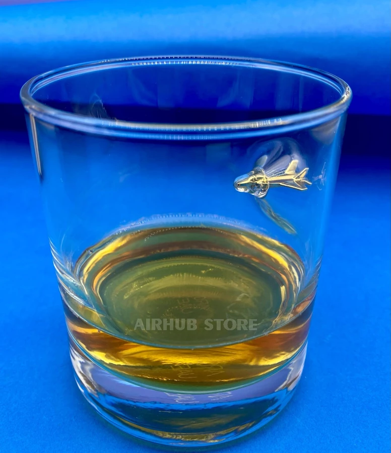 The thick transparent glass emphasizes the metal figure, and the side placement of the aircraft ensures comfort of use. The glass is suitable for whiskey, bourbon, rum, and other beverages and looks equally impressive when empty or full.