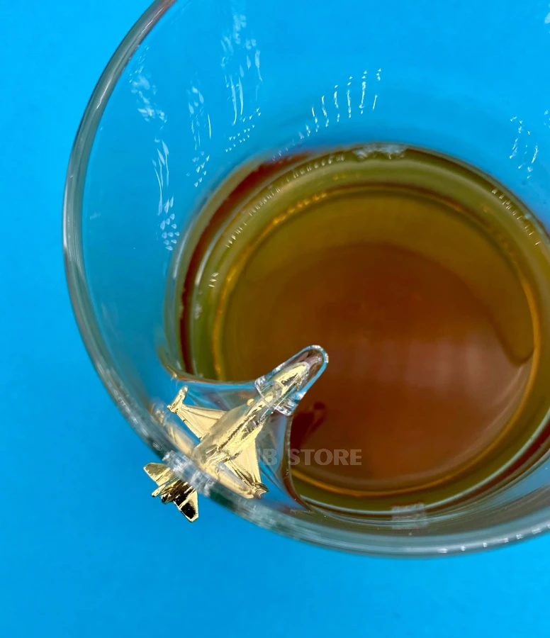 The F-16 Fighting Falcon looks like it's flying through the sky right in the middle of your glass.