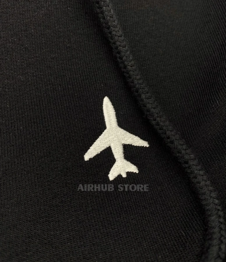The main emphasis is placed on minimalistic but expressive elements - embroidered silhouettes of airplanes that symbolize the freedom of flight and the dynamics of movement. Black embroidery on black fabric creates the effect of depth and restrained elegance, which emphasizes the premium nature of the product. Additional details, such as neat red and green accents, recreate real aircraft navigation lights, adding a special charm and authenticity to the sweatshirt.