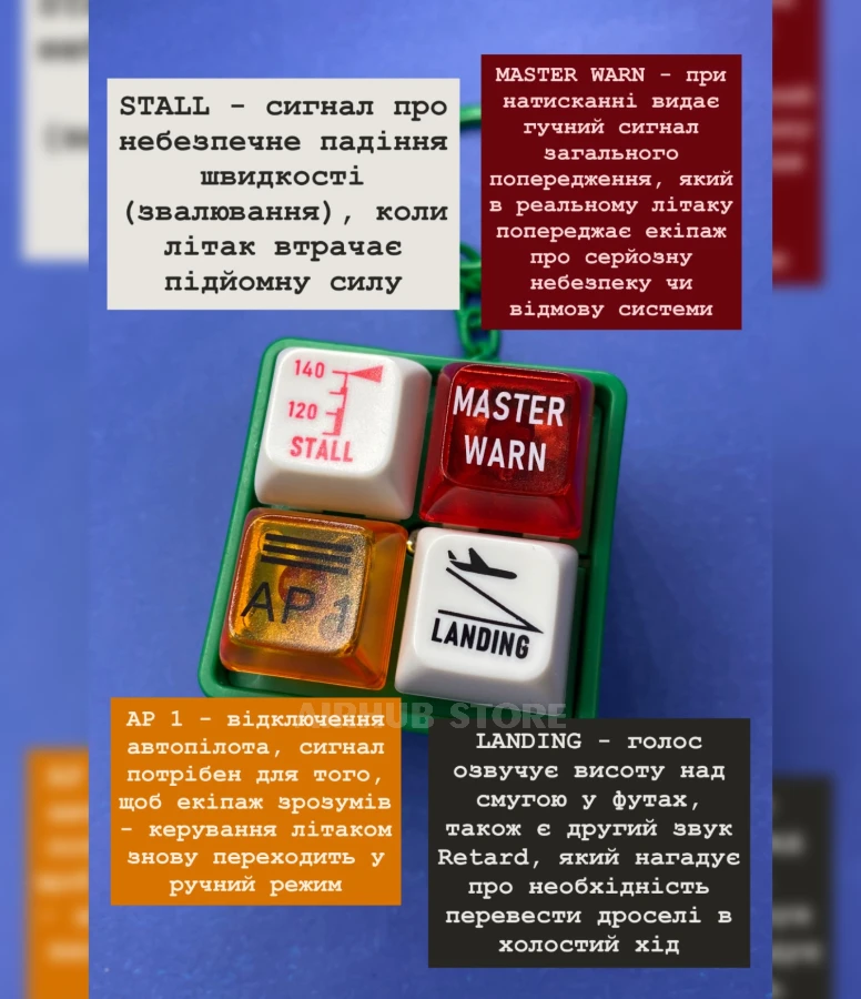 This Airbus A320 Aural Warning Simulator aviation keychain-panel conveys the atmosphere of a real cockpit. Pressing each button triggers the original aircraft signals:
