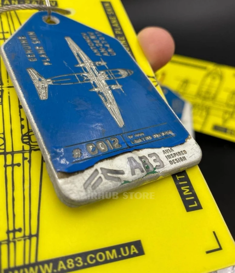 The keychain was made from the skin of the An-24 airplane. All the keychains have a unique serial number, and only 1000 pieces were made.