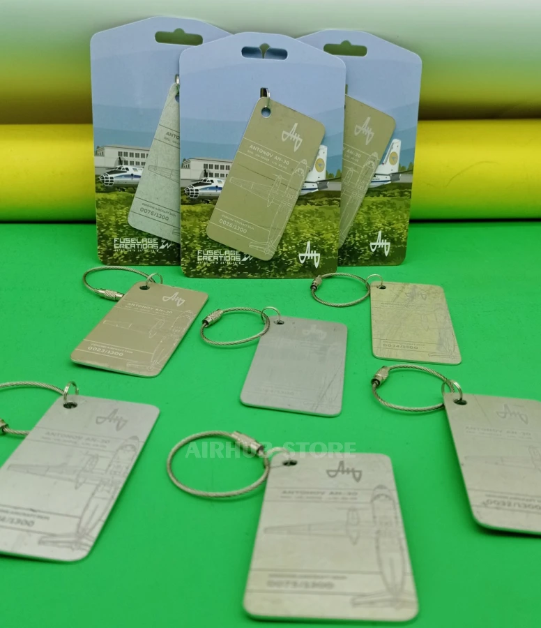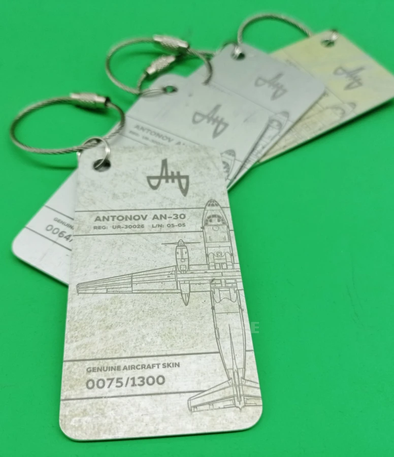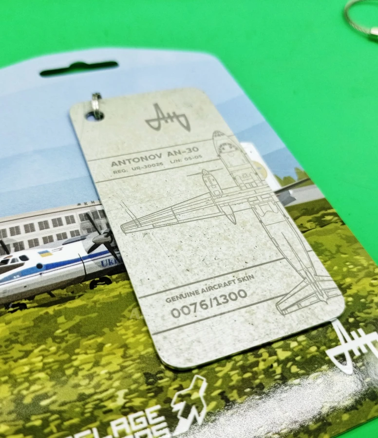 The keychain was made from the skin of the An-30 airplane. All the keychains have a unique serial number, 1300 pieces were made in total.