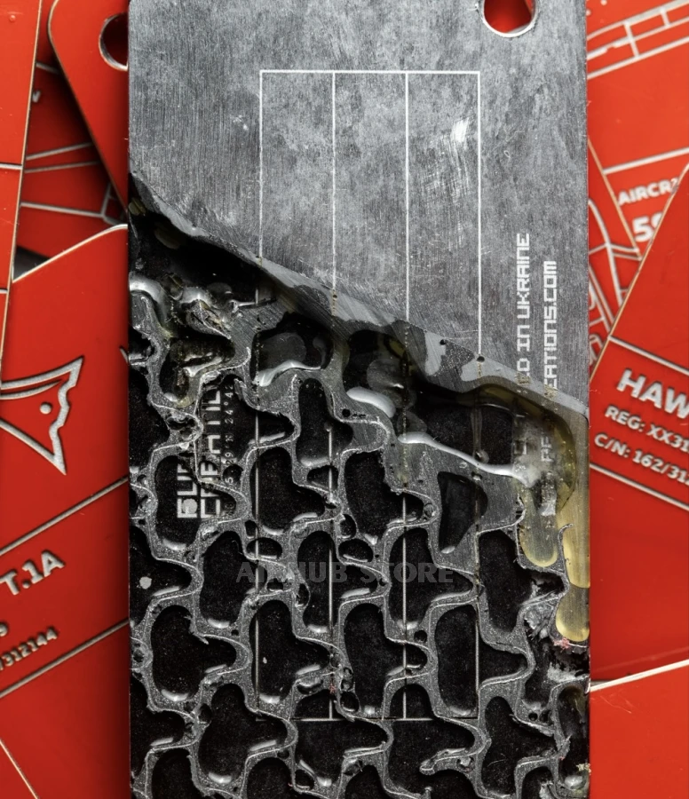 The keychain is made of real airplane skin, the airplane is cut into 286 pieces of keychains, each with its own unique number. The keychains are cut from the fuselage of a Mi-24P, military number 32 Red, registered as RF-95286. It was shot down near the village of Kozarovychi in the Kyiv region of Ukraine on March 5, 2022.